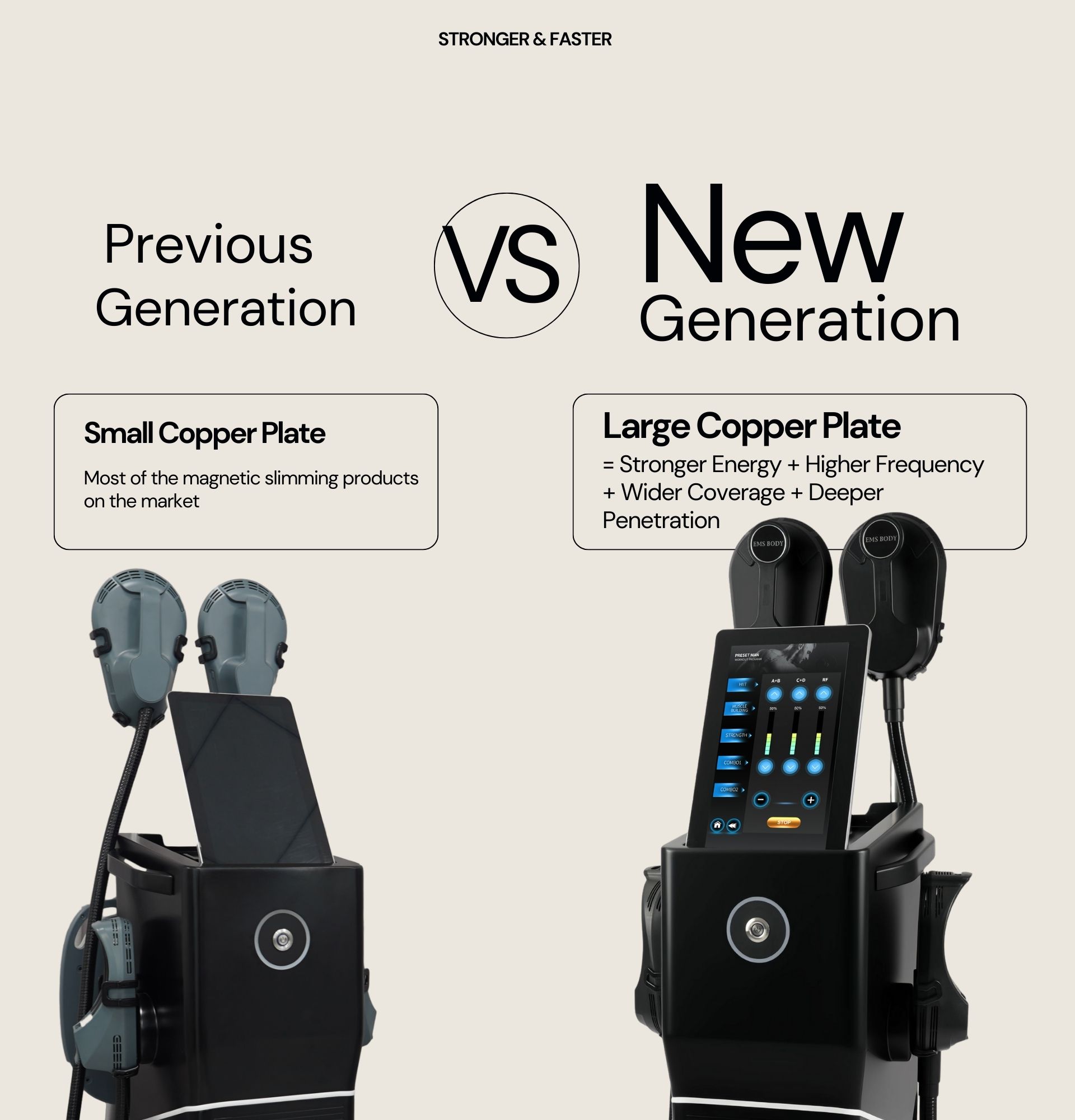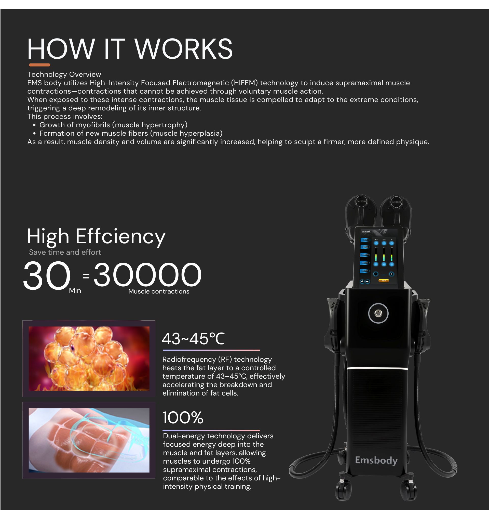 1. SPECIAL DESIGN: Ems Body Sculpt High Intensity Pulsed Electromagnetic (HIPEM) technology builds muscle and burns fat at the same time. Electromagnetic pulses induce supramaximal muscle contractions which force muscle tissue to adapt, leading to an increase in muscle growth while burning fat though lipolysis.